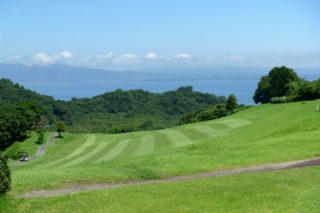 晴れた日には、はるか四国・豊後水道が眺望できる雄大な丘陵コース。ティグランドが高く打ち下ろしの9ミドルホールは当コースの代表的ホール。ティショットも思いっきり打てます。