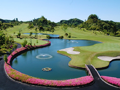 丘陵コース。自然の地形をそのままに造成されたコースだが、高低差はほとんど感じられずホール間も広くとられていてのびのびとプレーが楽しめる。フェアウェイはフラットで、ラフに入るとマウンドなどあって厄介なショットになる。アウト、インとも上がりホールに池を配して、ここではスリリングなシーンが現出。いずれも2打の落下地点から池が絡んできて、アプローチでもショットのブレを水面が待ち受ける恰好のホームホール。