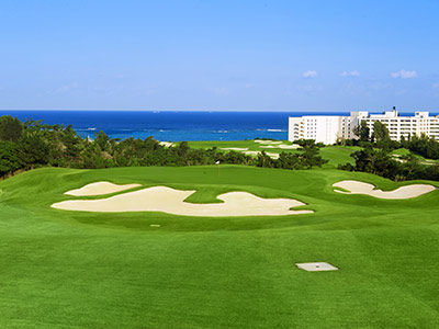 ターコイズブルーに輝く東シナ海を見下ろす丘陵地にある全27コース。はるか本部半島や伊江島まで見渡せる壮大な景観を前にプレーするのは爽快で距離のあるコース、フェアウェイはフラットで幅広く、特にショートホールは地形を巧みに織りこみ、各ホールが独特の個性を出しています。
